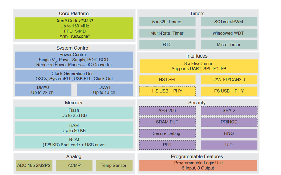 manages to consume very little power. The M33 core is crafted in Armv8-M architecture and has advanced security
