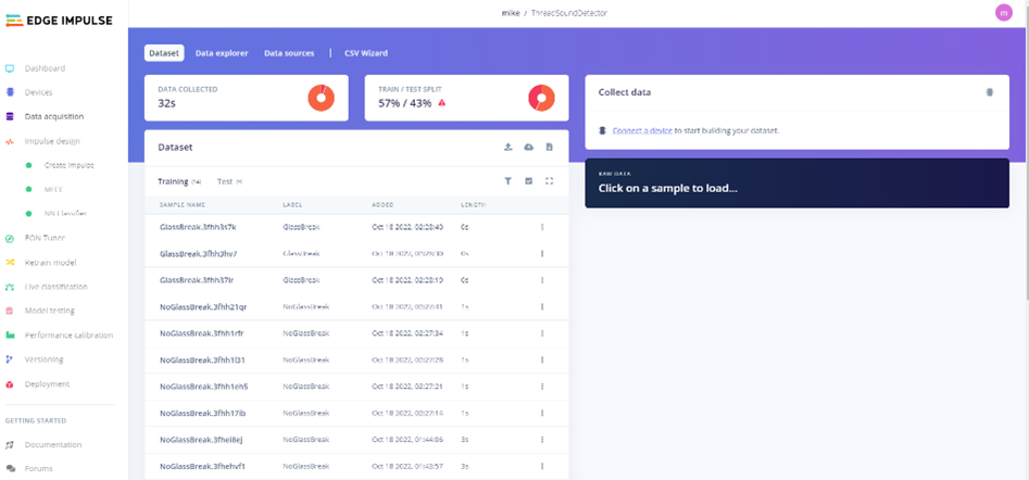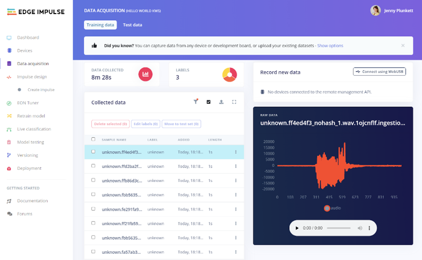 Welcome to the second blog in our Edge Impulse Fundamental series. In the first blog, we demonstrated the various mechanisms Edge Impulse offers. In this blog, we will take a practical look at the overall Edge Impulse workflow: from data collection and training to firmware deployment on targeted edge devices. To help with this, let’s imagine a real-world example. In this case, let’s assume we are trying to build a device that listens for a “secret” series of knocks and unlocks a door if the correct sequence of knocks is detected. We will leverage the microphone aboard the Arduino Nano 33 BLE Sense development board.