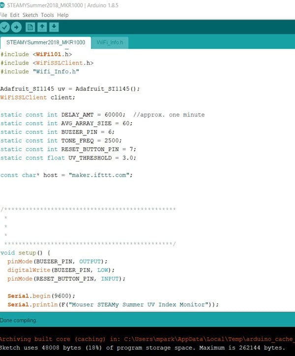 6. Test the connections established up to this point just to ensure that you have wired everything correctly. To do this, go to Mouser’s GitHub site and upload the Arduino STEAMYSummer2018_MRK1000.ino file and the Wifi_Info.h file. Once you have successfully loaded the code, fire up the serial monitor for the Arduino Integrated Development Environment (IDE) and ensure that you are getting visible, infrared (IR), and UV sensor readings. If you are not seeing a green light-emitting diode (LED) on the MKR1000 or are getting the error message “Cannot find the Si1145” in the serial monitor, be sure to check the wiring diagram again (Figure 2).