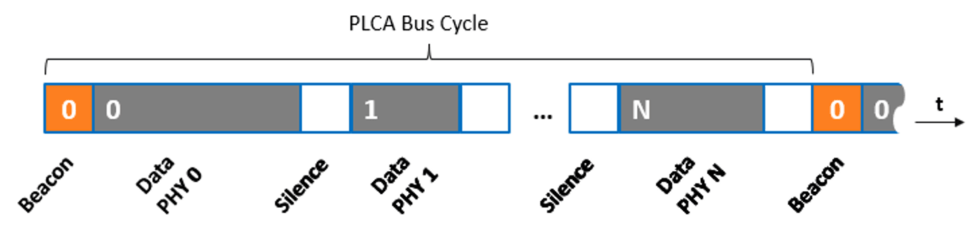 To achieve reliable, deterministic data transmission, the standard also defines Physical Layer Collision Avoidance (PLCA). By dividing the network into N transmit slots, the coordinator node (typically defined as Node 0) initiates the cycle with a beacon synchronisation marker (Figure 3). Subsequently, each node can pass data, if available, in its assigned slot. This provides bounded latency to meet the needs of time-sensitive applications.