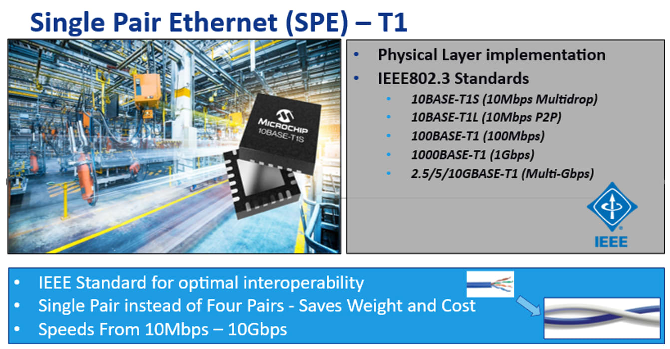 Single Pair Ethernet (SPE) is part of the solution that should change this. New physical layers (PHYs) in the IEEE 802.3 standard (Figure 1) enable standard Ethernet MACs on microcontrollers and system-on-chip (SoC) devices to implement SPE over a twisted pair connection (Table 1). In some cases, the technology can also meet electromagnetic compatibility (EMC) and electromagnetic interference (EMI) requirements using unshielded cables, providing room for additional cost savings.