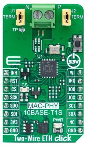 Figure 5: The Two-Wire ETH Click board from MikroE makes any microcontroller with an SPI interface 10BASE-T1S capable. (Source: Mouser Electronics)