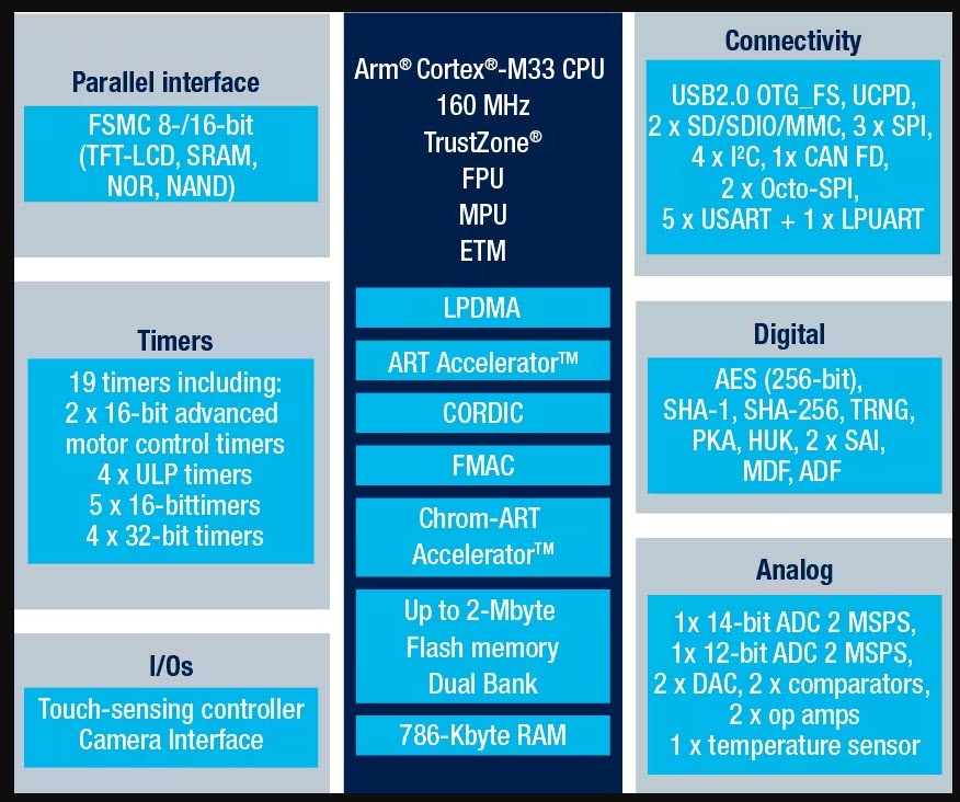 This development kit is powered by the STM32U585A (Figure 2), a 160 MHz Arm® Cortex®-M33 microcontroller secured by Arm’s Trustzone® technology containing 2 Mbytes of flash and 768K bytes of RAM to house rather complex IoT designs. The Trusted Base System Architecture (TBSA) from Arm embeds secure boot, data storage, and firmware updates, and firmware isolation is supported using securable peripherals, memories, and I/O.