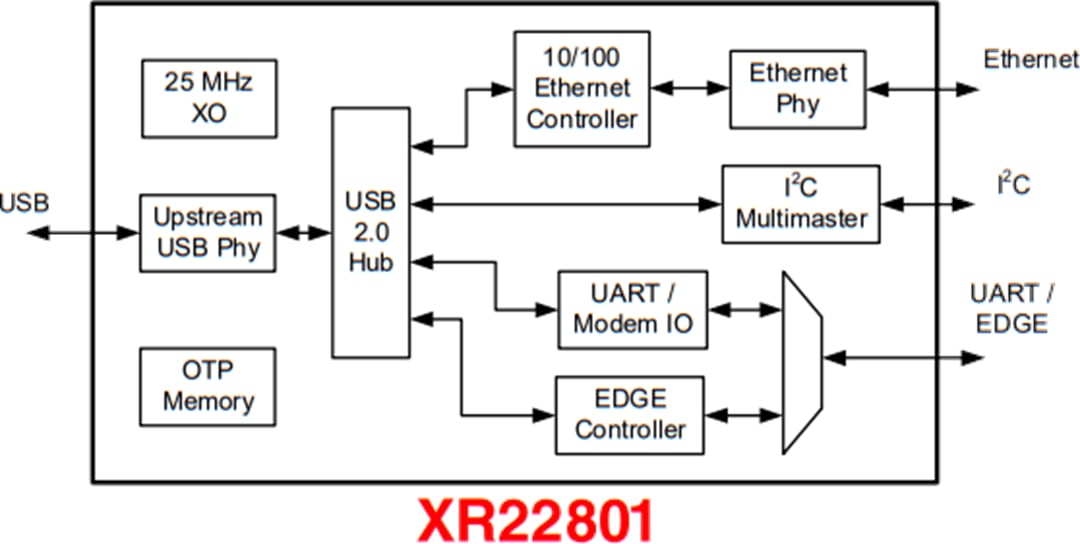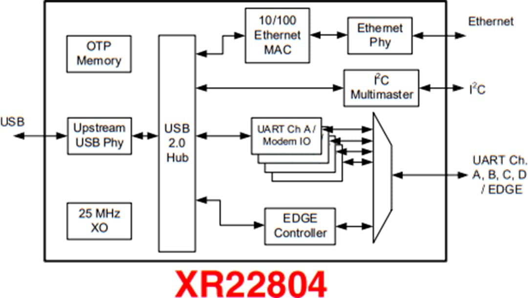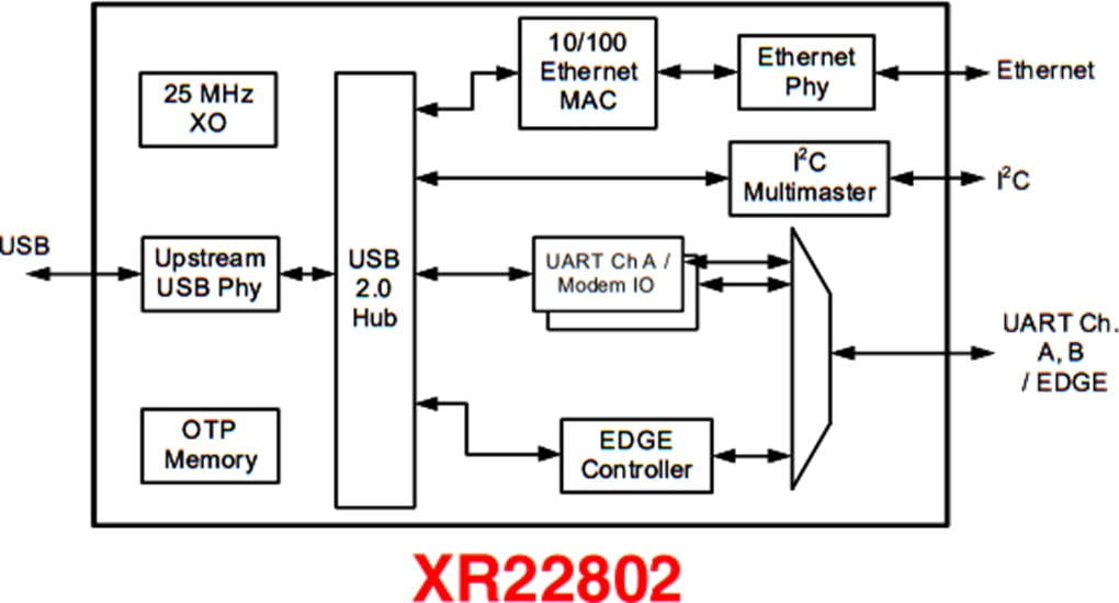 MaxLinear Hi-Speed USB to 10/100 Ethernet Bridge ICs are Hi-Speed USB 2.0 compound devices with an embedded hub and up to seven downstream USB functions. The XR2280x Ethernet Bridge ICs integrate 10/100 Ethernet MAC and PHY, a multi-master capable I2C controller, an Enhanced Dedicated GPIO Entity (EDGE) controller, and up to 4 UARTs. The upstream USB interface of these devices have an integrated USB 2.0 PHY and device controller that is compliant with both Hi-Speed (480Mbps) and Full-Speed (12Mbps) USB 2.0. The vendor ID, product ID, power mode, remote wakeup support, and maximum power consumption are among the values that can be programmed using the on-chip One-Time Programmable (OTP) memory.The XR2280x ICs are compliant with IEEE 802.3 and support auto-negotiation, auto-MDIX, checksum offload, auto-polarity correction in 10Base-T, and remote wakeup capabilities.