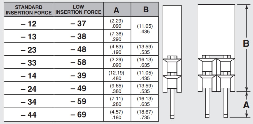 - Standard and low insertion force contacts with 0.025" (0.635mm) square tails for PC/104 application